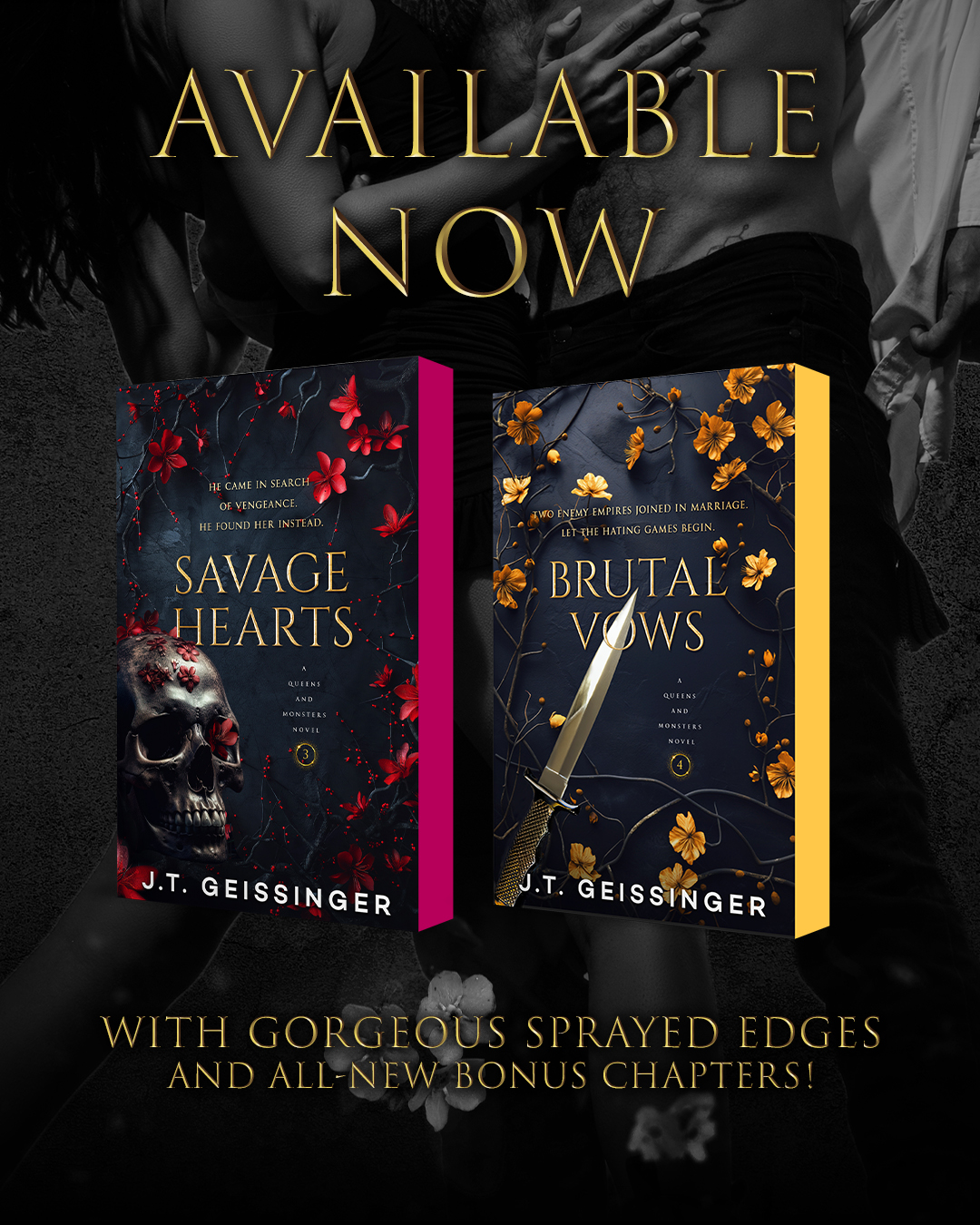 The deluxe edition print release of Savage Hearts & Brutal Vows by J.T. Geissinger are now LIVE featuring beautiful sprayed edges and a never-before-seen bonus chapter! Grab your copies today! Savage Hearts: https://bit.ly/4jHBbFw Brutal Vows: https://bit.ly/42rcA0k Savage Hearts DELUXE EDITION–featuring beautiful garnet sprayed edges and a bonus chapter! The third book in the scorchingly hot mafia romance Queens and Monsters series by USA Today bestselling author J.T. Geissinger, where John Wick meets Romeo and Juliet. Savage (adjective): 1) Not domesticated; wild and untamed 2) A brutal or vicious person 3) Malek Antonov He’s a myth. A ghost. A legend. A Bratva assassin so feared, some won’t even dare to speak his name. He comes in search of vengeance for the death of his brother, but what he finds instead is me. A girl he thinks is someone else. Someone unrelated to the man who killed his brother. Except I am. And when he finds out my true identity, he decides to take me as repayment for what he lost. Now, I’m a little bird trapped in a cage, and the only way to survive is to make friends with the monster who captured me. But friendship isn’t what the monster has in mind. Queens and Monsters Reading Order: Ruthless Creatures Carnal Urges Savage Hearts Brutal Vows Brutal Vows DELUXE EDITION–featuring beautiful golden sprayed edges and a bonus character interview! The fourth book in the scorchingly hot mafia romance Queens and Monsters series by USA Today bestselling author J.T. Geissinger, where John Wick meets Romeo and Juliet. An Irish mobster with a brutal grudge. An Italian mafia princess with a dark secret. Two enemy empires joined in sacred marriage vows. Let the hating games begin. Reyna: If this arrogant Irish mobster my brother sold my niece to thinks I’m going to play nice over this arranged marriage BS, he should think again. I don’t care if this match with the Mob will make my brother capo of the Five Families. I don’t care how much money, territory, or power it will gain us. I especially don’t care that the Irishman is the sexiest man I’ve ever seen. I won’t allow my innocent niece to suffer the same way I did. Even if I have to kill him. Spider: I’m supposed to marry sweet, beautiful Lili. So why can’t I stop thinking about her swamp witch of an aunt? Reyna who hates me. Reyna who challenges me. Reyna with the guts of a Viking, the body of a fertility goddess, and the attitude of a feral cat. Nothing good can come of what I’m feeling for a woman who’s not the one in the wedding contract I signed. A woman I want so much, I’ll have to burn the whole world down to get. If she doesn’t kill me first. Queens and Monsters Reading Order: Ruthless Creatures Carnal Urges Savage Hearts Brutal Vows |